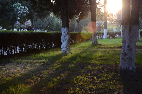 傍晚,当黄昏映着这片黄土地时,师大的操场显得格外安逸,放下忙碌了一天的疲倦身子,沿着这样一个被绿树裹着的林荫道,听着耳边喇叭里陈奕迅的《好久不见》,你会觉得自己好像也曾和这落日一同经历了生命中不再有的一天……明天一样很美好!留学生仍旧骑着单车,操场上的情侣依旧诉说着他们自己的小故事,还有一些勤奋的孩子照旧不舍自己的“之乎者也”。