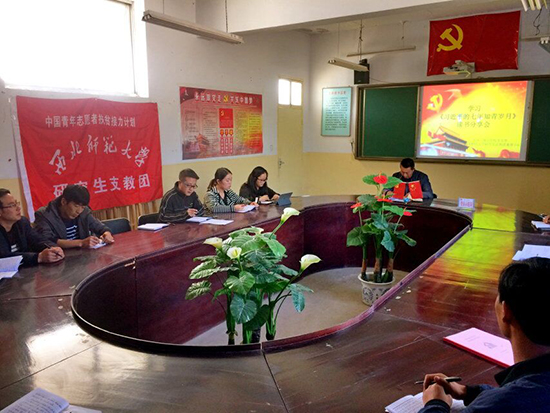 西北师大第六届“中国青年志愿者扶贫接力计划”研究生支教团的12名志愿者们分别在甘肃省武威市天祝藏族自治县第二中学、定西市陇西县通安中学和通渭县陇山学校,以不同形式学习了党的十九大精神,用实际行动续写着西部志愿者的青春篇章。
