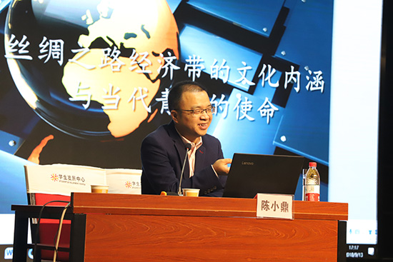 开班仪式后,兰州大学博士生导师陈小鼎教授作了题为《丝绸之路经济带的文化内涵与当代青年的历史使命》的首场报告。