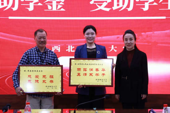 邓小娟代表学校向香港慈恩基金会、甘肃省人民政府港澳事务办公室赠送牌匾。2023年“陈登助学金”受助学生美术学院2021级学生何文鑫向香港慈恩基金会赠送书法作品。